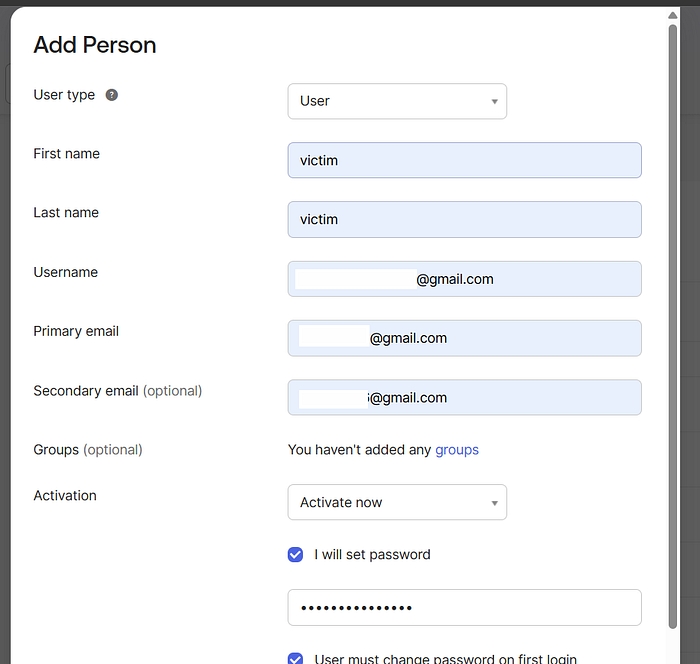 In your SAML IdP (Okta admin console), create/add a person with the victim email and set a password for that account.